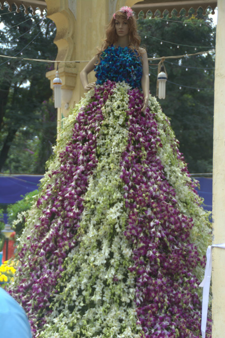 - A floral gown displayed on a mannequin at Mysuru flower show.