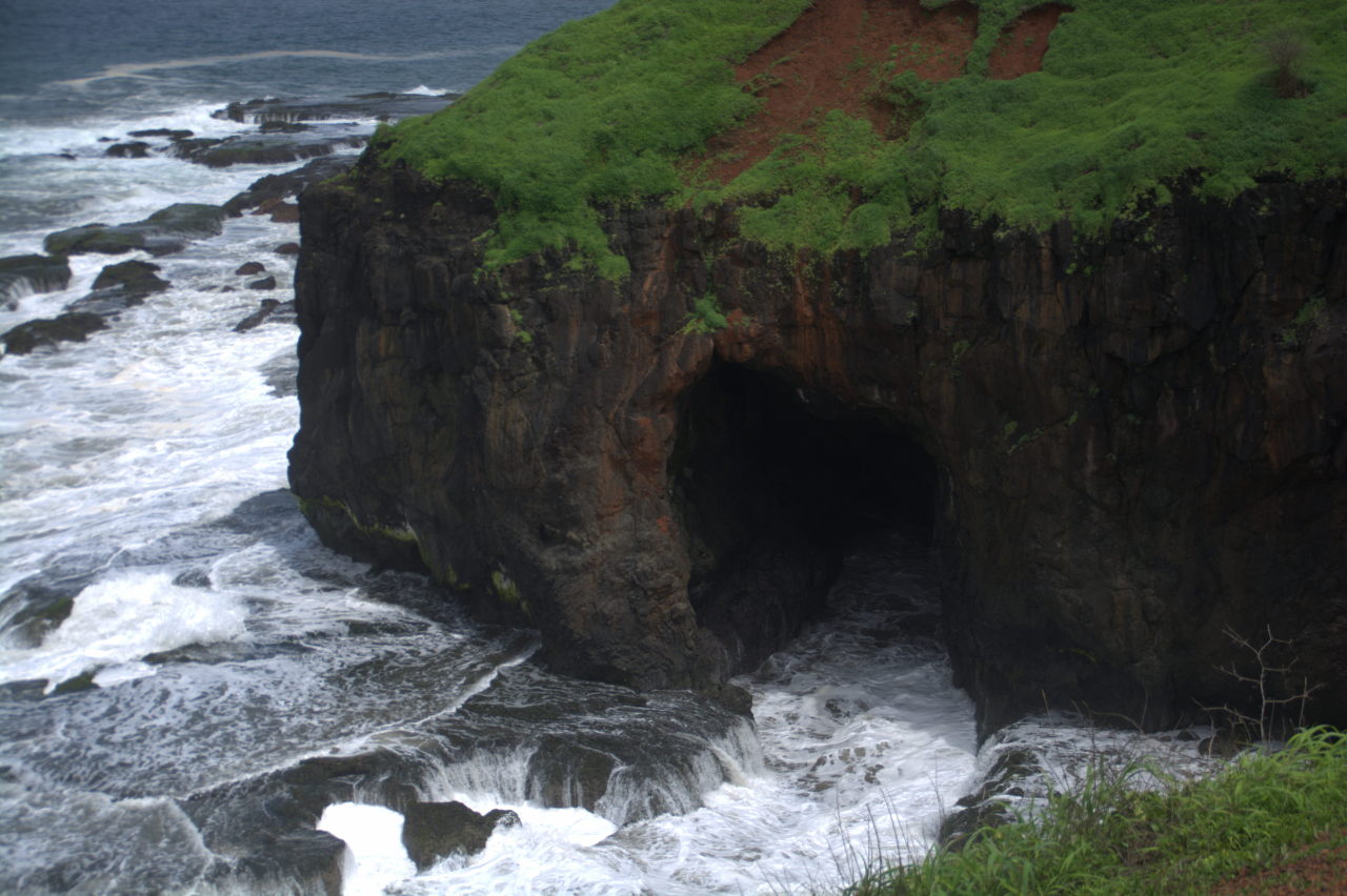 - A naturally formed cave at the base of the hill with Ratnadurg fort. The waves have carved out a huge cave from the rock.